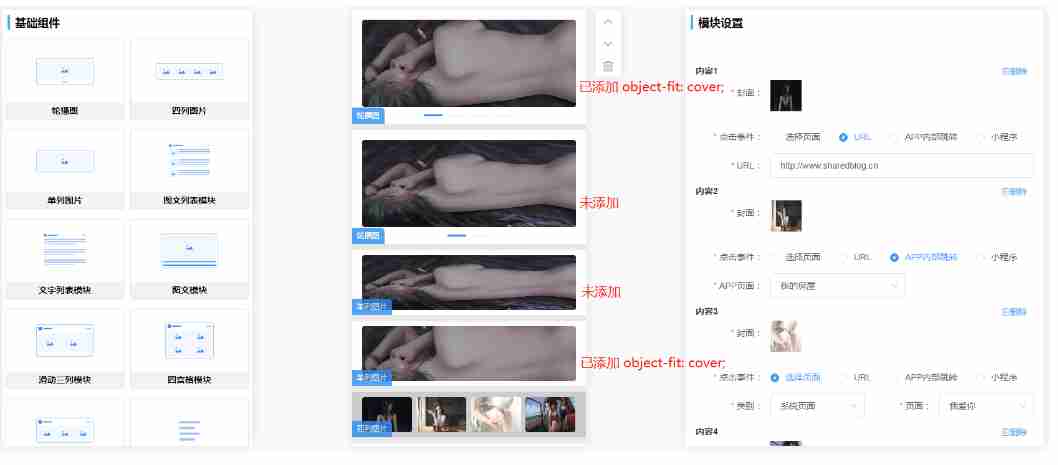 提测给测试小姐姐,在右侧上传了图片,说中间图片被挤压了,那么安排下,如上图所示,添加了红色注释,已添加的属性和未添加的属性图片进行对比所示,图片都是嵌套到一个固定宽高的div中,并且图片width和height都为100%,未添加object-fit: cover;属性的会导致图片挤压,而添加了object-fit: cover;属性的图片不会挤压,居中显示多余的会被裁剪,美滋滋。